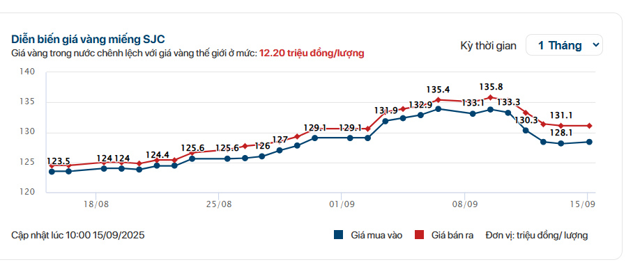 Đến sáng nay 15/9, giá đã “hạ nhiệt” rõ rệt. Công ty SJC niêm yết vàng miếng ở 128,4 triệu đồng/lượng mua vào và 131,1 triệu đồng/lượng bán ra, gần như đi ngang so với cuối tuần nhưng thấp hơn đáng kể so với đỉnh 9/9.
