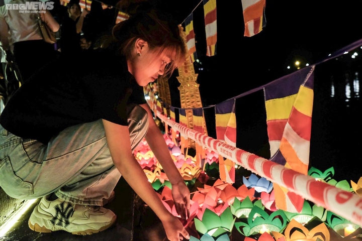Thả đèn cầu an cho người thân đã khuất - một hoạt động mùa Vu lan. (Ảnh: Ngô Nhung)