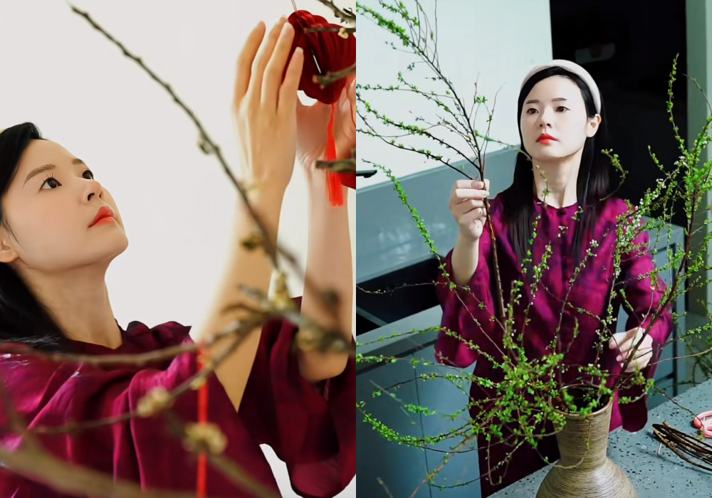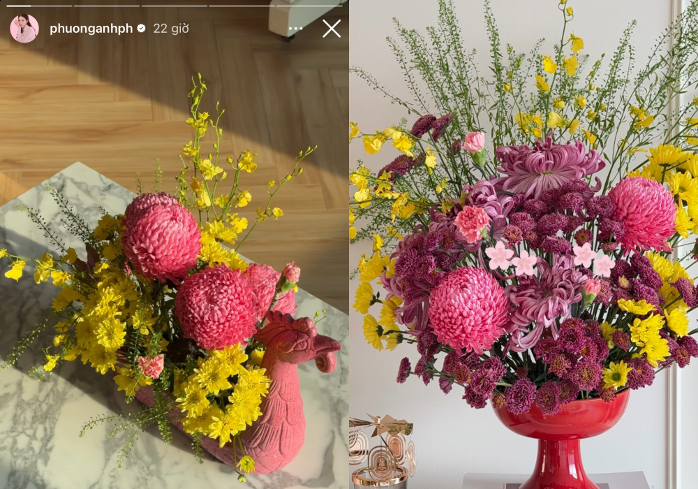 Bên cạnh Tăng Thanh Hà và Lan Khuê, nhiều mỹ nhân Vbiz khác như Midu, Hương Liên, Diễm My... cũng không đứng ngoài cuộc chơi "flex" nhà cửa. Từ những bình hoa cao quá đầu người, cành đào, mai kích thước khủng cho đến những mâm cỗ được chuẩn bị công phu, tất cả góp phần tạo nên bức tranh 29 Tết đầy rộn ràng.