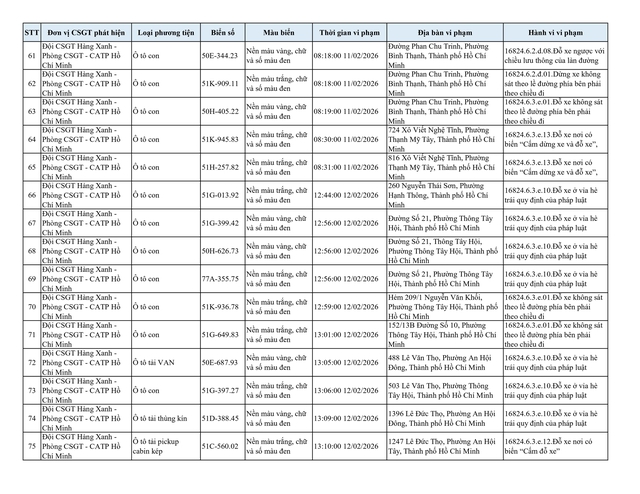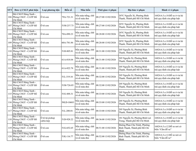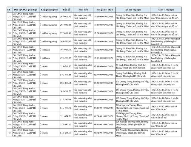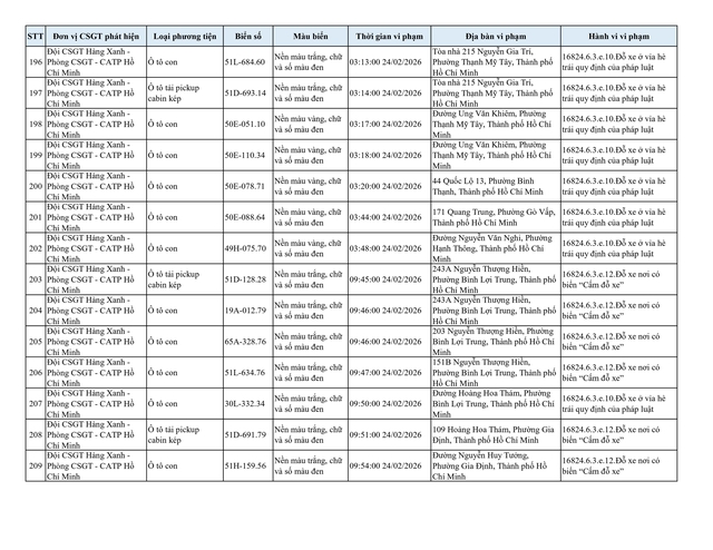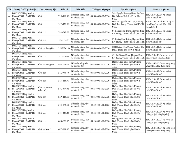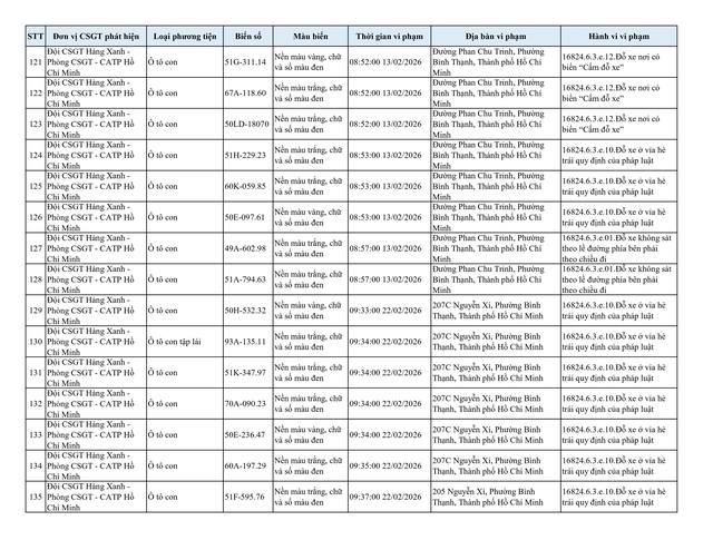 Chiều 2.3, Đội CSGT Hàng Xanh (thuộc Phòng CSGT – PC08 Công an TP.HCM) thông tin về danh sách phương tiện vi phạm lỗi dừng, đỗ không đúng quy định đã bị lực lượng chức năng ghi nhận và xử lý qua hình ảnh.