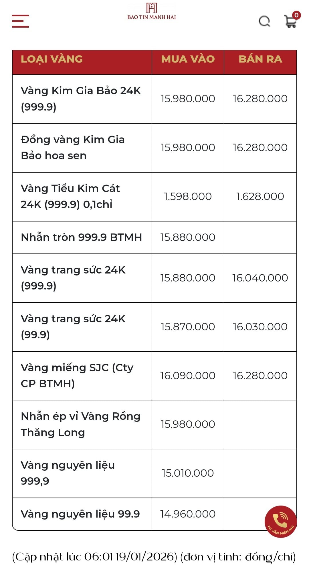 Giá vàng hôm nay tại Bảo Tín Mạnh Hải. Lưu ý giá vàng có thể điều chỉnh thay đổi.