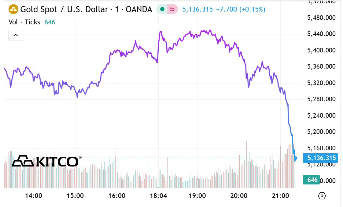 Thị trường kim loại quý rung chuyển mạnh trong chiều thứ Năm sau một trong những cú bán tháo đột ngột và dữ dội nhất từng ghi nhận. Giá vàng lao dốc tới 380 USD, tương đương gần 7%, chỉ trong vòng 28 phút, trong khi giá bạc thậm chí giảm tới mức gây sốc 11% trong cùng khoảng thời gian.