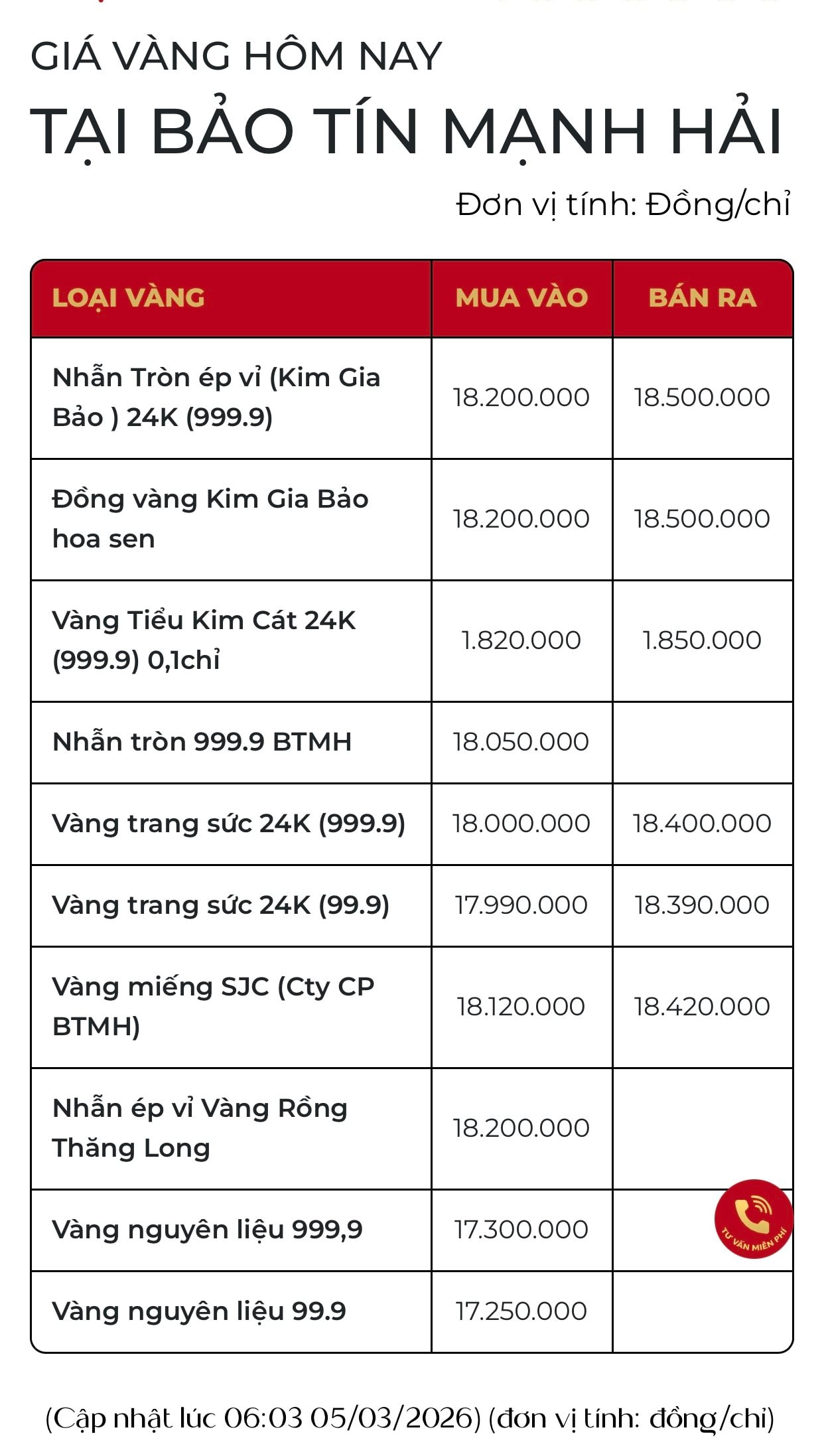 Tại Bảo Tín Mạnh Hải, giá vàng nhẫn Kim Gia Bảo dao động quanh mức 182 - 185 triệu đồng/lượng (bán ra - mua vào).