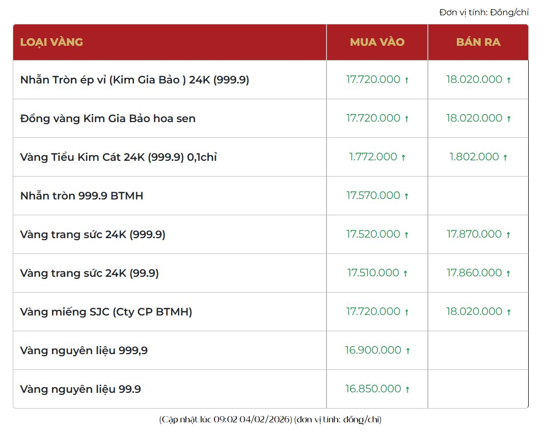 Vàng Tiểu Kim Cát 24K (loại 0,1 chỉ): Mua vào 1,772 triệu đồng/chỉ – Bán ra 1,802 triệu đồng/chỉ (Tương đương 177,20 - 180,20 triệu đồng/lượng).