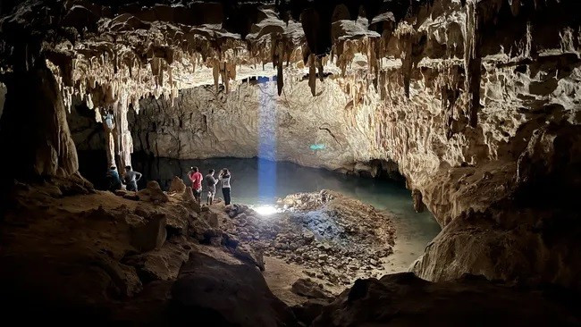 Khách du lịch khám phá Grutas Tzabnah, hang động ở Bán đảo Yucatán, Mexico. Một khối nhũ đá trong hang động này đã giúp các nhà nghiên cứu đánh giá tình trạng hạn hán ảnh hưởng đến người Maya trong thời kỳ Cổ điển Cuối cùng. (Ảnh: Mark Brenner)