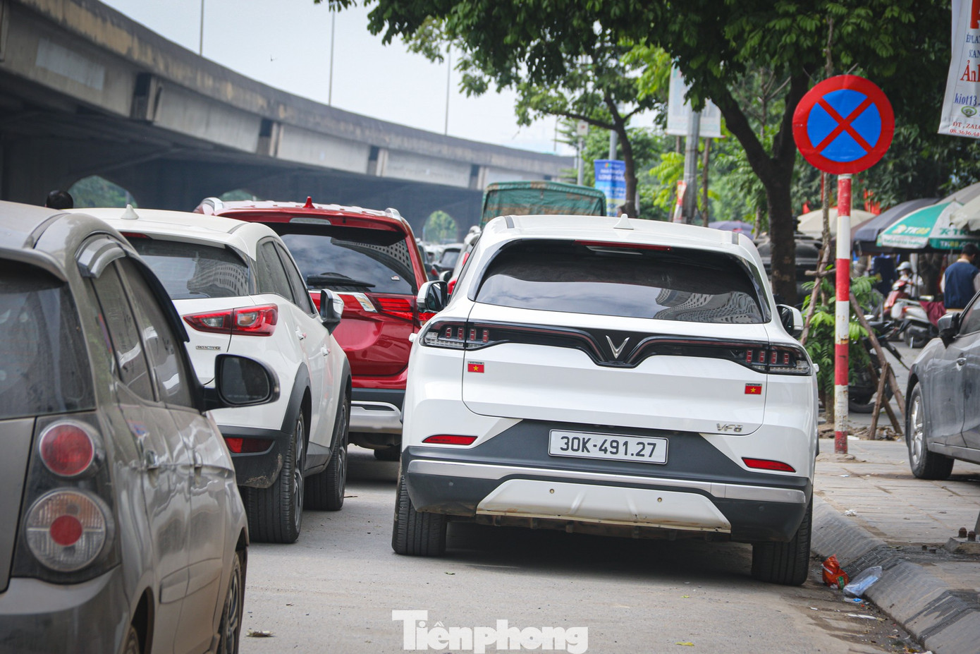 Bốn hàng xe tràn ra, chiếm phần lớn lòng đường dành cho các phương tiện lưu thông.