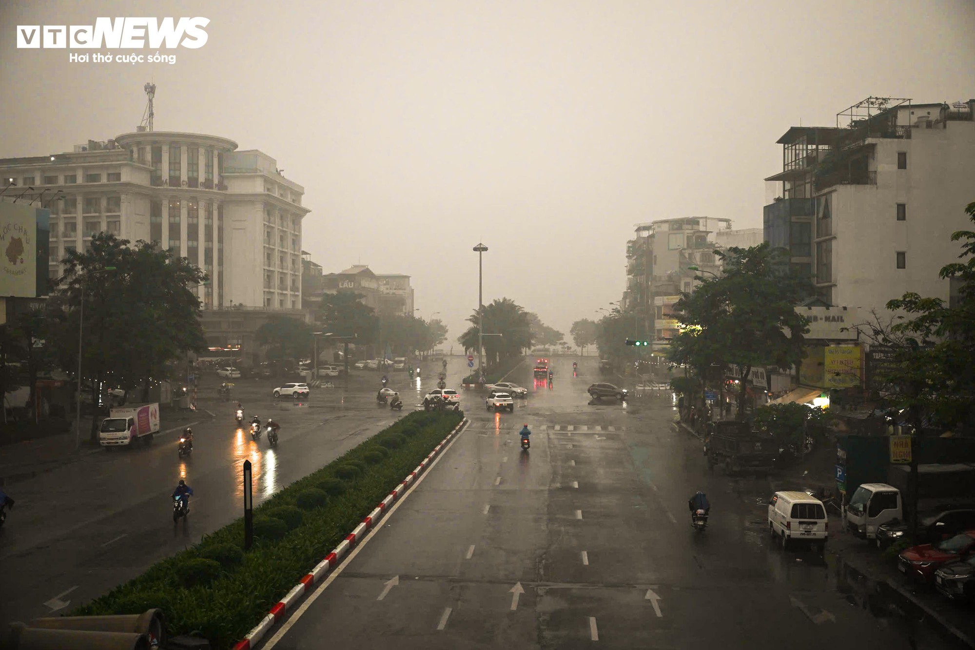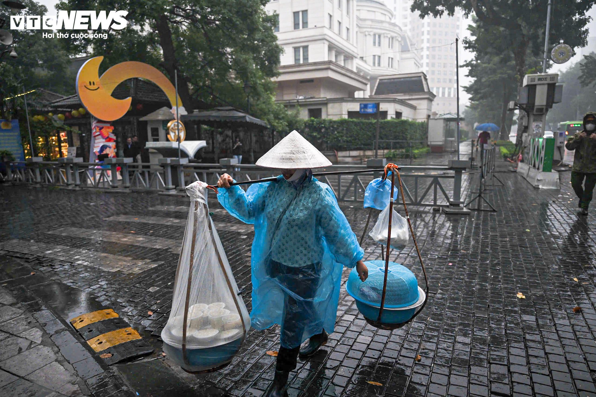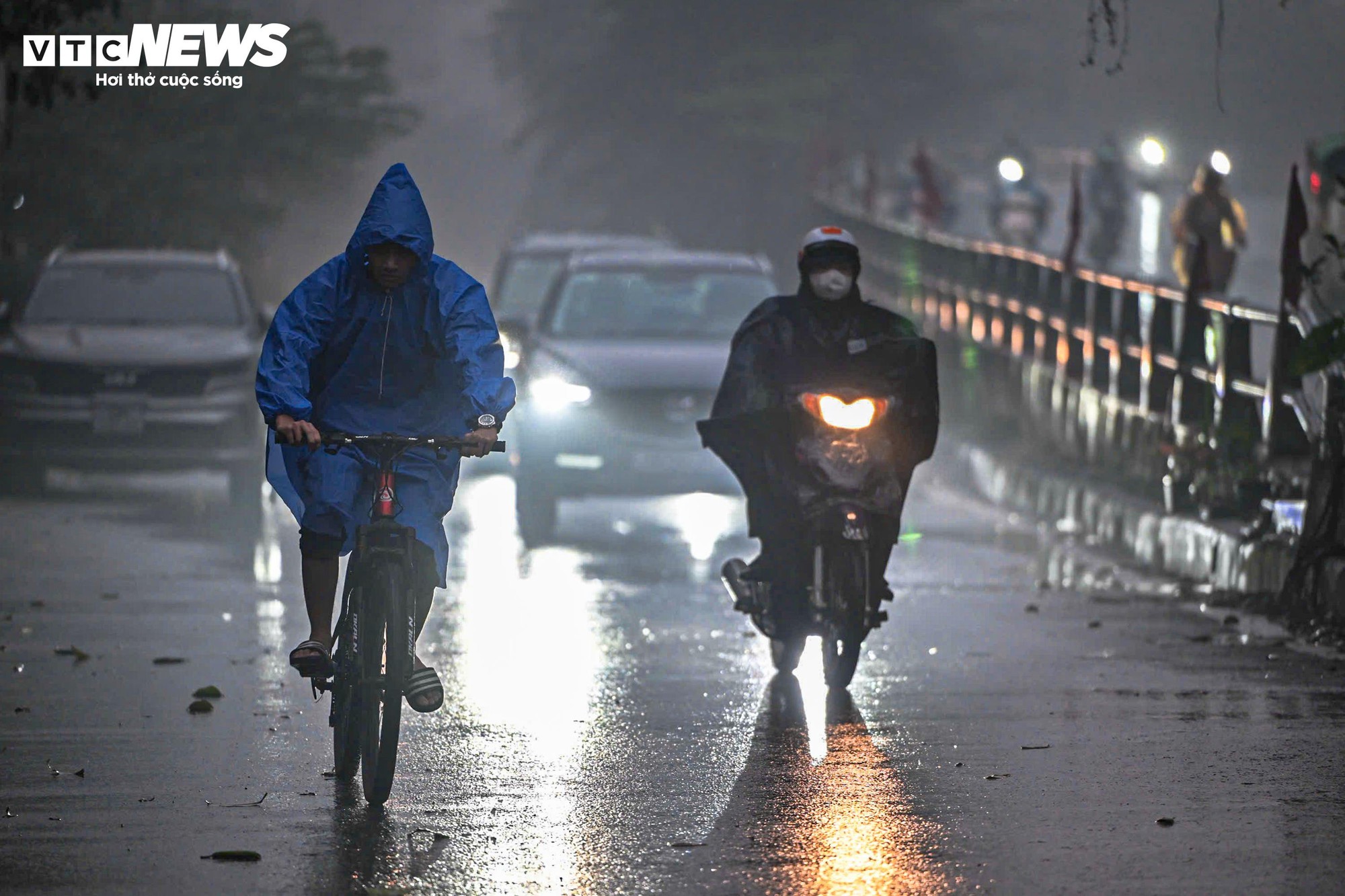 Trên đường phố, người đi làm mặc áo dày, đội mũ trùm để tránh gió. Mưa lất phất khiến xe cộ di chuyển chậm hơn.