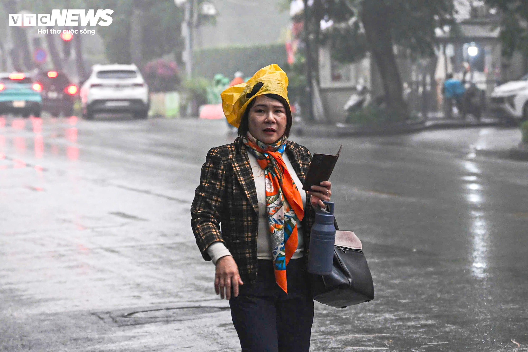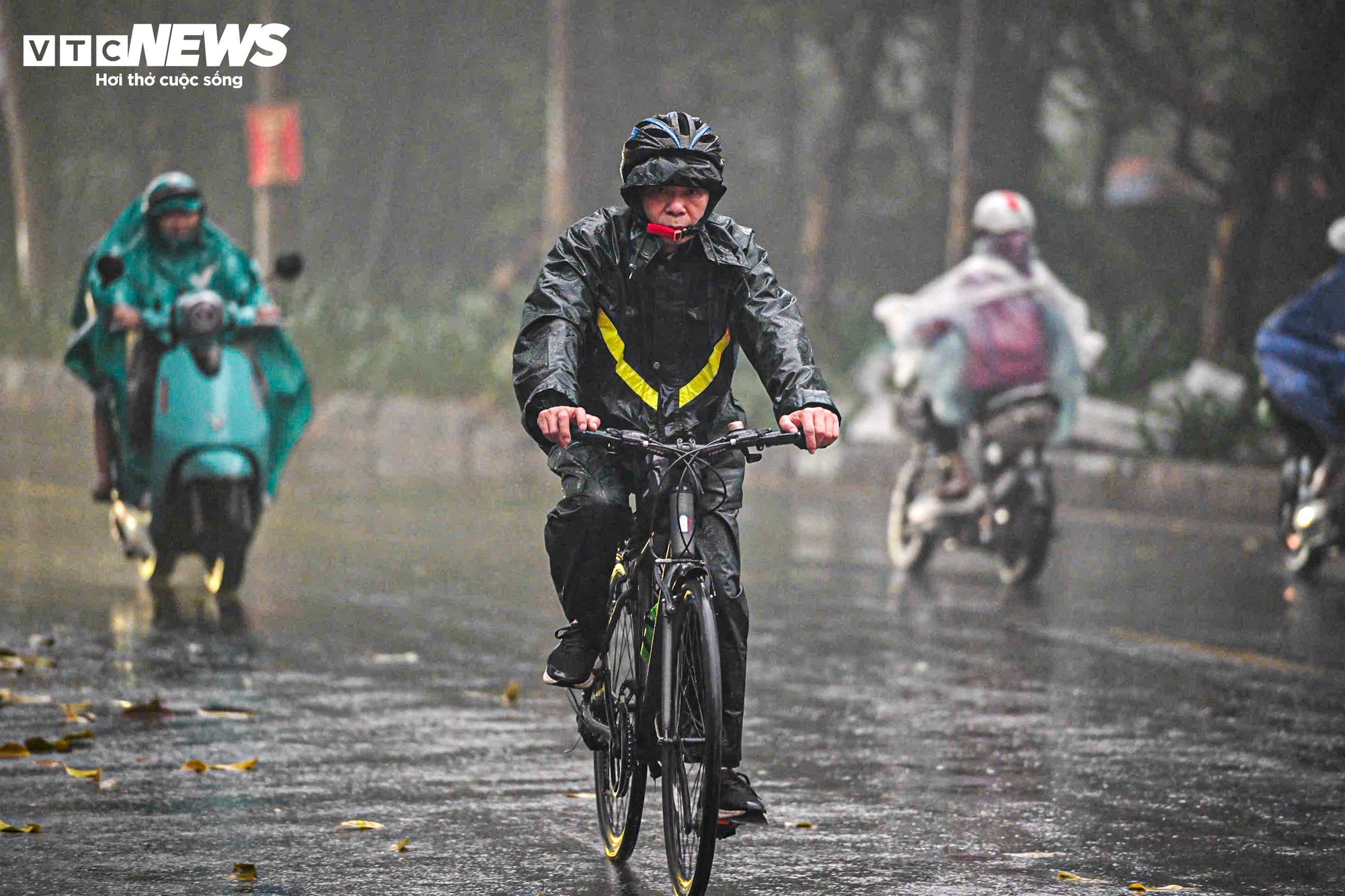 Gió lạnh thổi mạnh, người đi đường chật vật giữa mưa rét đầu ngày.