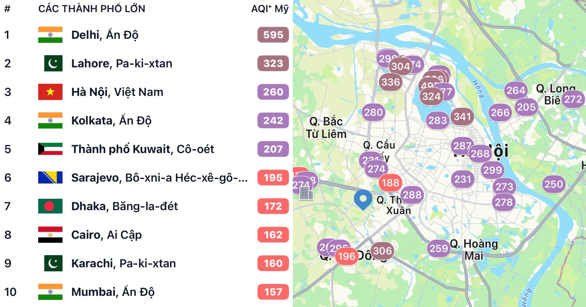 Không khí lạnh kèm mưa xuất hiện sáng 13/12 nhưng chất lượng không khí Hà Nội chưa cải thiện rõ. Theo ứng dụng AirVisual, gần 8h cùng ngày, AQI Thủ đô vẫn thuộc top 3 ô nhiễm toàn cầu.