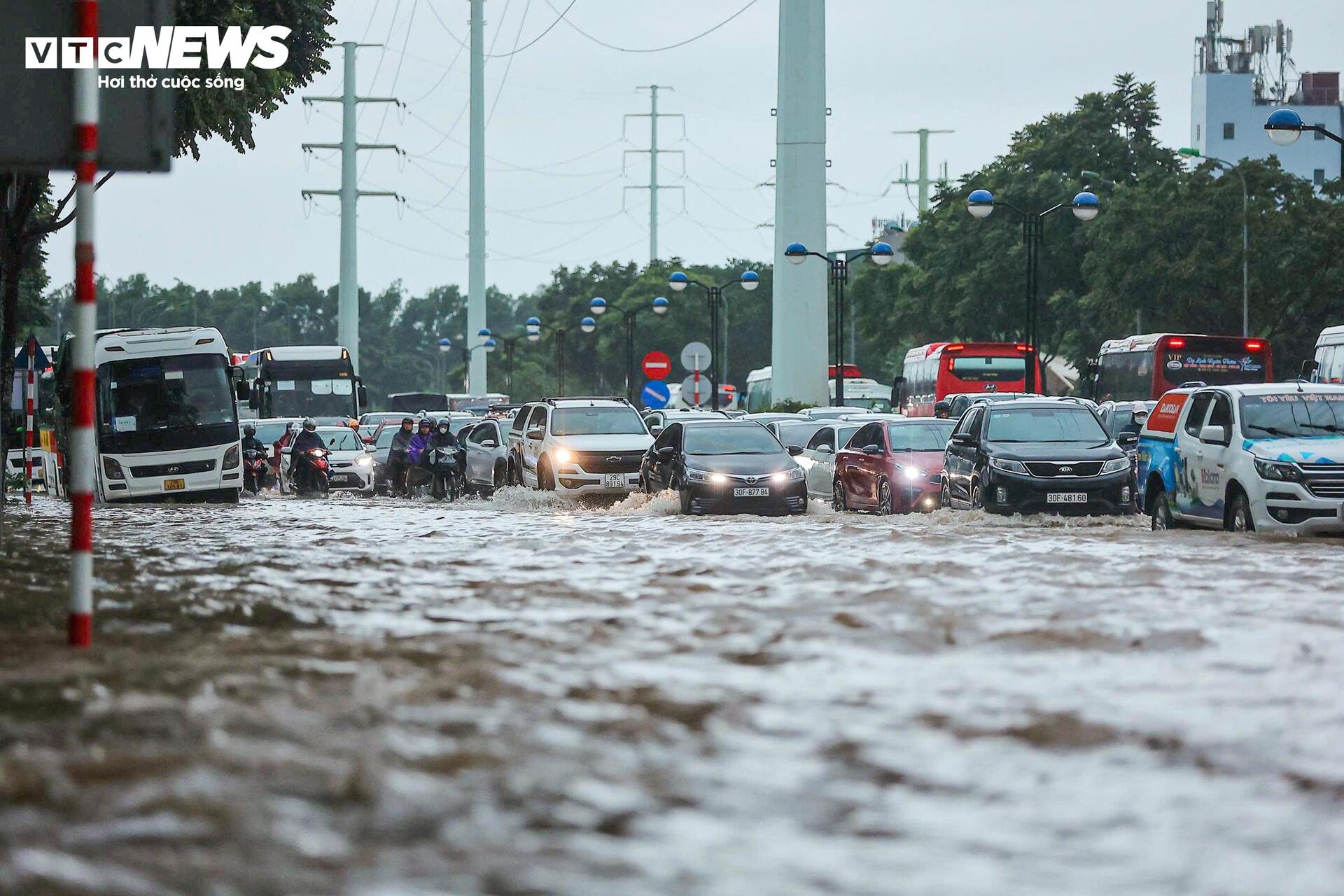Điển hình, trước sân vận động Mỹ Đình, đoạn đường Lê Quang Đạo ở cả hai chiều chìm trong "biển nước". Xe máy và ô tô nối đuôi nhau di chuyển chậm chạp, nhiều người phải xuống dắt bộ, lội nước giữa dòng xe đông nghịt. Có thời điểm, dòng phương tiện gần như "đứng hình" do ùn tắc nghiêm trọng.