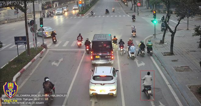 Camera AI được lắp đặt tại nội đô Hà Nội (nút giao phố Phạm Văn Bạch - Hoàng Quán Chi), đã phát hiện 27 trường hợp không đội mũ bảo hiểm, 63 trường hợp mô tô, xe gắn máy không chấp hành hiệu lệnh của đèn tín hiệu - vượt đèn đỏ.