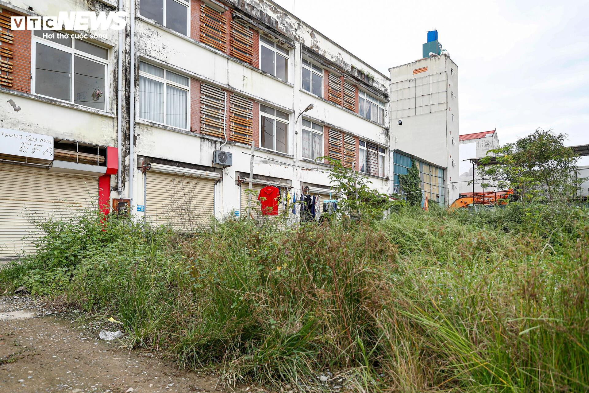 Cỏ dại mọc um tùm, bao phủ quanh khu chợ bỏ hoang.