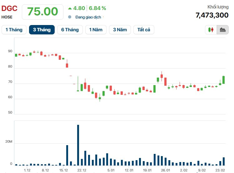 Phiên giao dịch ngày đầu năm Bính Ngọ 2026 (23/2), cổ phiếu DGC cũng đã tăng 2,63%. Tính đến giờ này, trong 2 ngày giao dịch đầu tiên sau nghỉ Tết Nguyên Đán, giá cổ phiếu DGC đã tăng gần 10%.