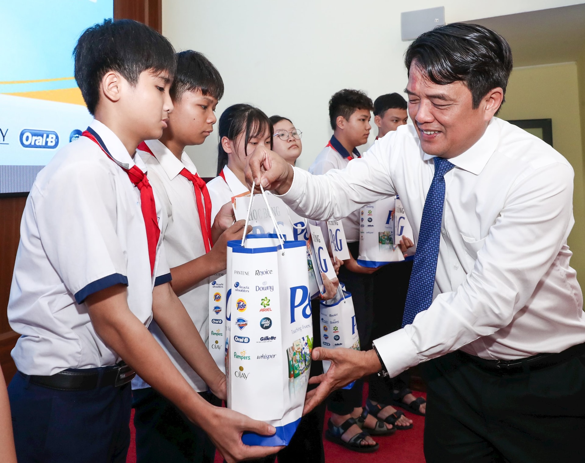 Ông Stefan Wysocki, Giám đốc Nhà máy Bến Cát, P&G Việt Nam, trao các phần quà từ Công ty P&G cho học sinh nhận học bổng.