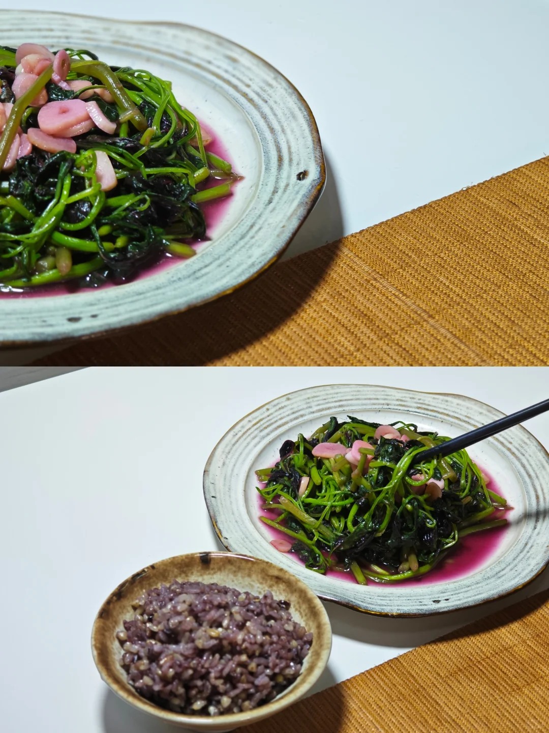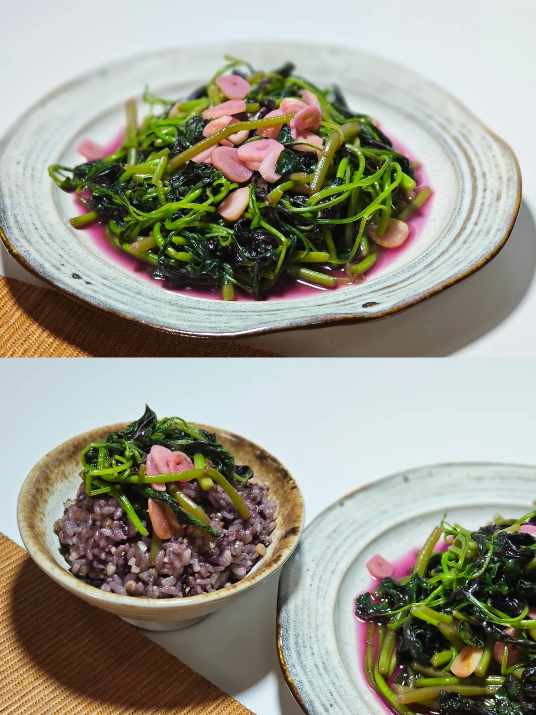 Ở bước này, nhiệt độ cần được giữ ở mức lớn để rau xanh nhanh chóng tái lại mà không bị nhũn nát hay mất đi độ giòn tự nhiên vốn có. Đôi đũa đảo đều tay liên tục, khi quan sát thấy rau bắt đầu xẹp xuống thì cho thêm một chút xíu nước lọc để om mềm, tạo điều kiện cho phần nước cốt màu hồng tía đặc trưng tiết ra hòa quyện cùng mỡ tỏi.
