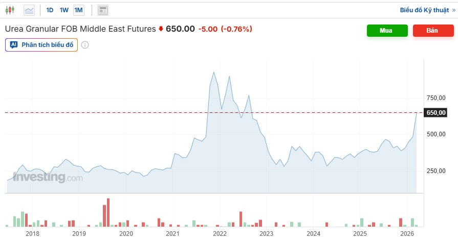 Theo dữ liệu giao dịch quốc tế, giá ure granular FOB Trung Đông đã tăng lên khoảng 650 USD/tấn, trong khi vùng giá phổ biến trong năm trước chỉ quanh 380–400 USD/tấn. Đây cũng là vùng giá cao nhất trong vòng 3,5 năm qua (kể từ tháng 9/2022).