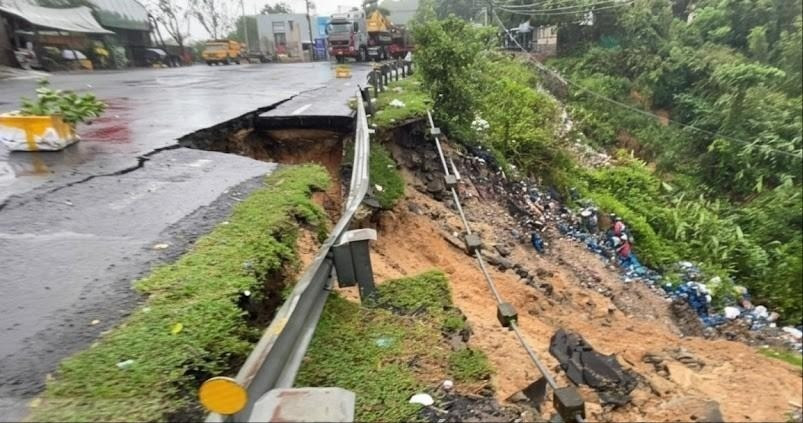 Vị trí sạt lở trên tuyến QL1 đoạn qua xã Hòa Xuân dài khoảng 30m. Ảnh: Báo Đắk Lắk.
