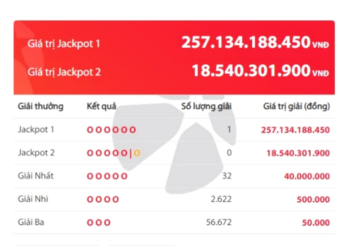 Trong kỳ quay số mở thưởng sản phẩm Vietlott Power 6/55 hôm nay (ngày 20/01/2026), giải thưởng jackpot 1 trị giá hơn 257.134.188.450 đồng tìm thấy người trúng giải. Trong khi đó, Jackpot 2 hơn 18.540.301.900 đồng vô chủ.
