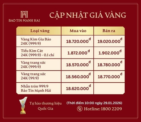 Giá vàng miếng Bảo Tín Mạnh Hải niêm yết giá vàng miếng ở mức 18,72 triệu đồng/chỉ chiều mua vào và 19,02 triệu đồng/chỉ chiều bán ra. Vàng nhẫn cũng được thương hiệu này giao dịch quanh mốc 18,62 triệu đồng/chỉ chiều mua vào.