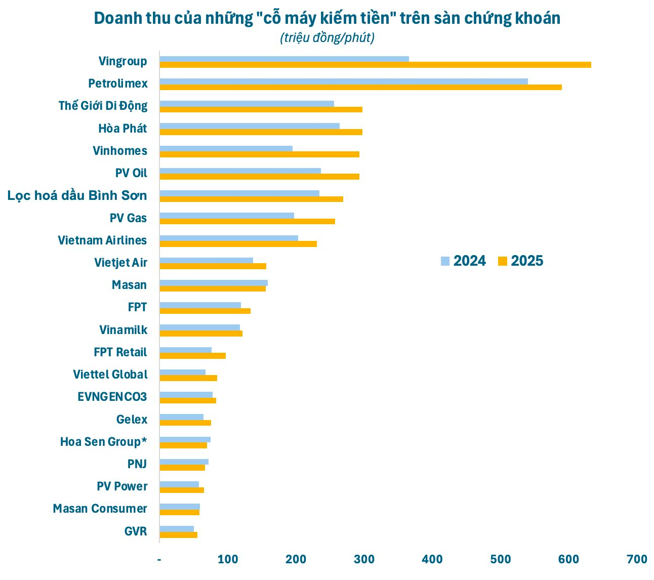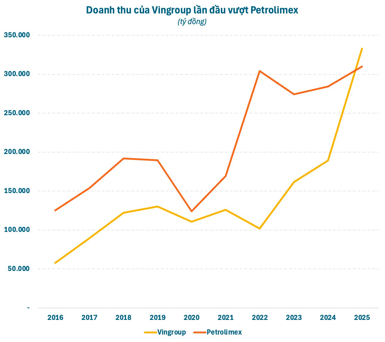 Cú bứt phá ngoạn mục đưa Vingroup soán ngôi Petrolimex (PLX) trở thành quán quân doanh thu năm 2025. Đây là lần đầu tiên “đại gia” bán lẻ xăng dầu lớn nhất cả nước đánh mất vị trí này dù doanh thu cũng đạt kỷ lục. Năm 2025, doanh thu của Petrolimex tăng gần 9% so với cùng kỳ, đạt gần 310.000 tỷ đồng, tương ứng bình quân mỗi phút, kiếm hơn 590 triệu đồng .