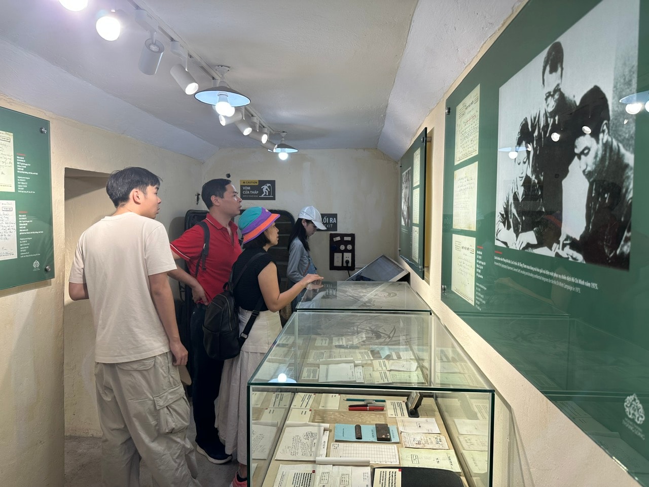 Điểm nhấn đặc biệt thu hút khách tham quan tại Hoàng thành là căn hầm lịch sử. Tại đây, nhiều bạn trẻ và các đoàn khách quốc tế tỏ ra hào hứng khi được trực tiếp trải nghiệm, tìm hiểu những tư liệu quý giá về thời kỳ kháng chiến chống Mỹ cứu nước của dân tộc. Ảnh: Hoàng Quyên