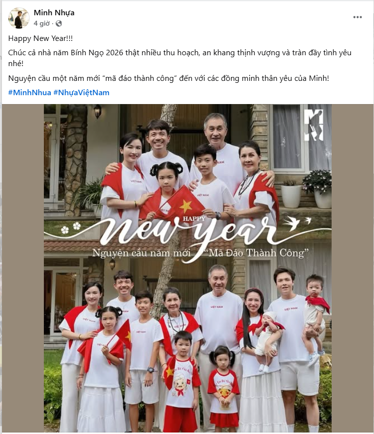 Mới đây, trên trang cá nhân, Minh Nhựa đã chia sẻ loạt ảnh đại gia đình trong dịp đầu năm. Anh gửi lời chúc năm mới Bính Ngọ 2026, cụ thể như sau: “Happy New Year!!! Chúc cả nhà năm Bính Ngọ 2026 thật nhiều thu hoạch, an khang thịnh vượng và tràn đầy tình yêu nhé! Nguyện cầu một năm mới ‘mã đáo thành công’ đến với các đồng minh thân yêu của Minh!”