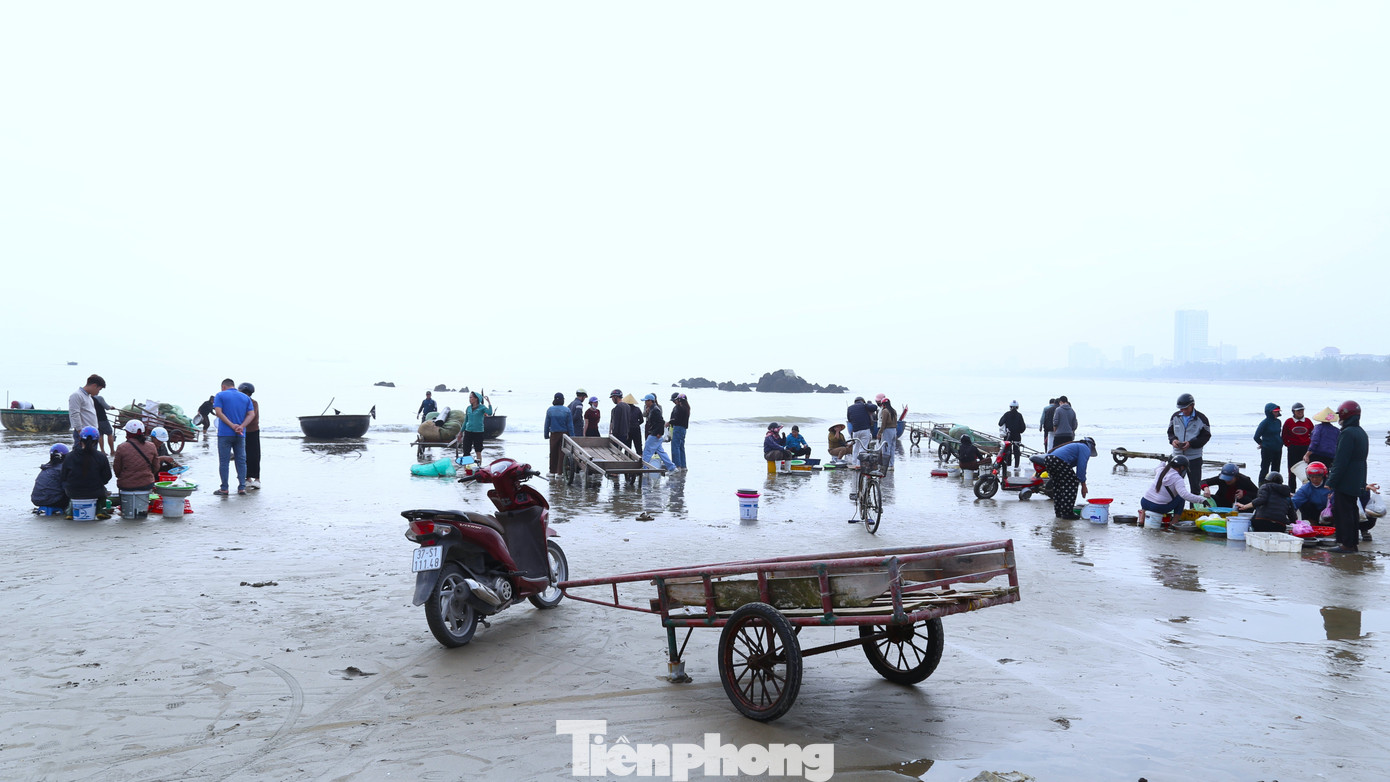 Khoảng 7 giờ sáng 20/2, từng đoàn thuyền thúng nối nhau vào bờ dọc bãi biển Cửa Lò (phường Cửa Lò, tỉnh Nghệ An) với cá, tôm, ghẹ… tươi rói. Trên bờ, hàng chục tiểu thương đã chờ sẵn.