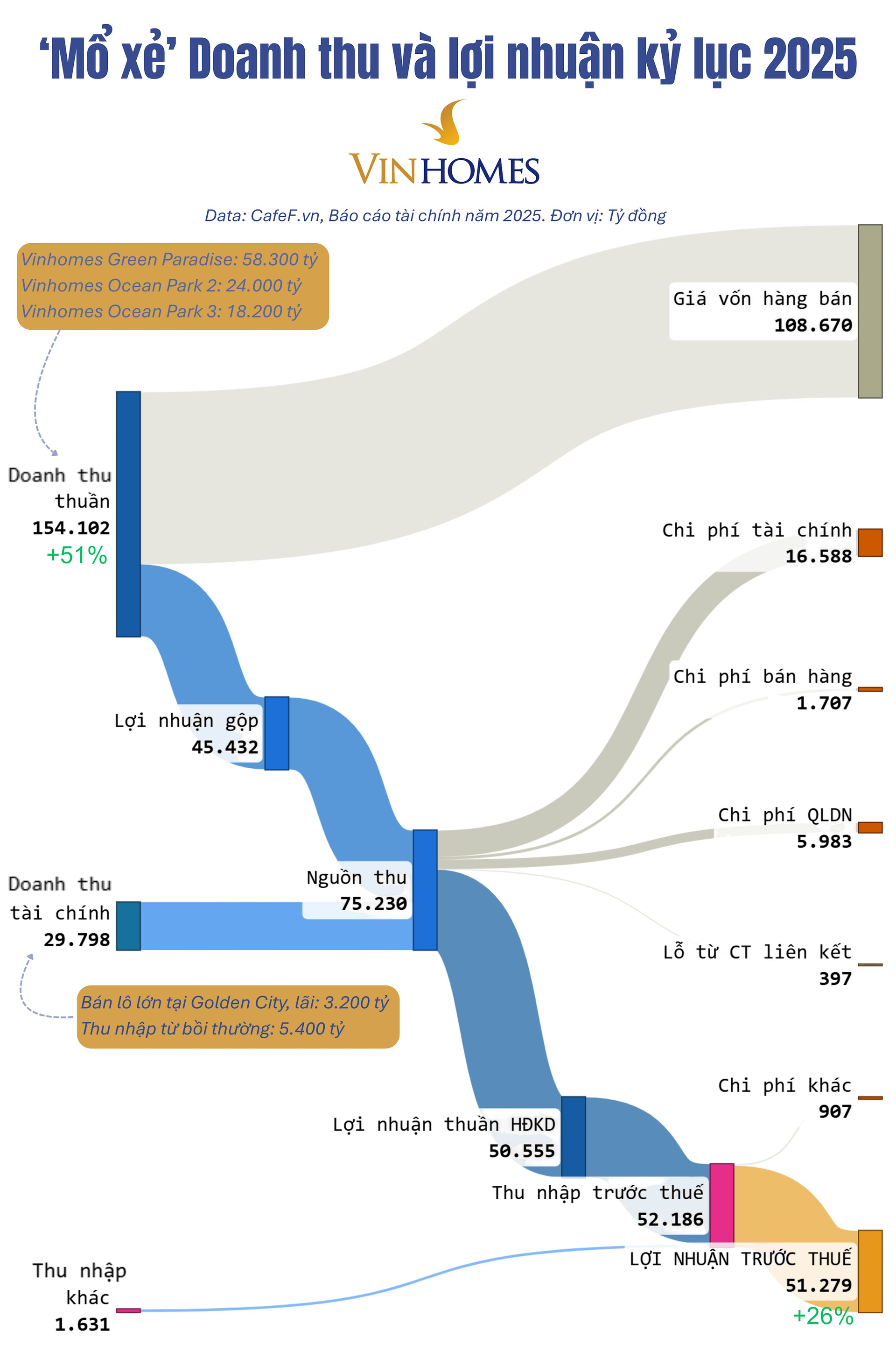CTCP Vinhomes (VHM) công bố Báo cáo tài chính năm 2025 với doanh thu thuần hợp nhất đạt 154.102 tỷ đồng, tăng 51% so với năm 2024. Nếu tính cả doanh thu từ các hoạt động cốt lõi và các hợp đồng hợp tác kinh doanh (doanh thu quy đổi), con số này đạt 183.923 tỷ đồng, tăng 30% so với cùng kỳ.