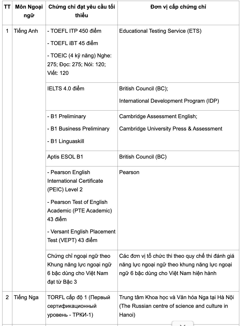 Bên cạnh đó, Bộ Giáo dục và Đào tạo cũng bổ sung chứng chỉ tiếng Anh quốc tế Versant English Placement Test (VEPT) với mức tối thiểu 43 điểm. Hai chứng chỉ này được đưa vào danh sách sau khi được công nhận tương đương với các bậc trong Khung năng lực ngoại ngữ 6 bậc dùng cho Việt Nam.