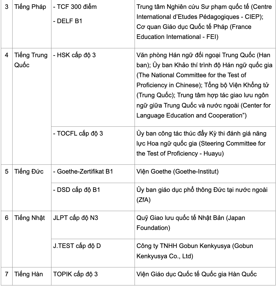 Danh sách 22 chứng chỉ ngoại ngữ được sử dụng để miễn thi môn Ngoại ngữ trong xét tốt nghiệp THPT năm 2026 được công bố như sau: