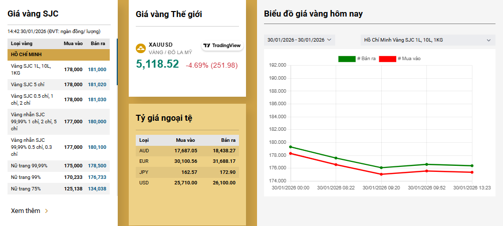 Trước đó vào lúc 10h hôm nay (30/1), SJC niêm yết giá vàng nhẫn tròn 9999 tại ngưỡng 176,8 triệu đồng/lương (mua vào) và 179,8 triệu đồng/lượng (bán ra), giảm tới 9,5 triệu đồng/lượng so với đầu giờ sáng và 11,2 triệu đồng so với mức đỉnh hôm qua (29/1).