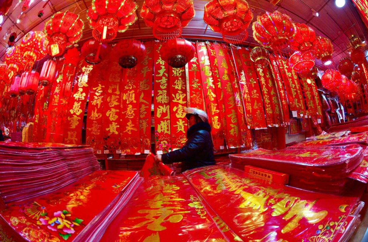Mọi người đi mua sắm đồ trang trí Tết Nguyên đán. Màu đỏ là màu rất may mắn trong văn hóa Trung Quốc - Ảnh: Getty Images