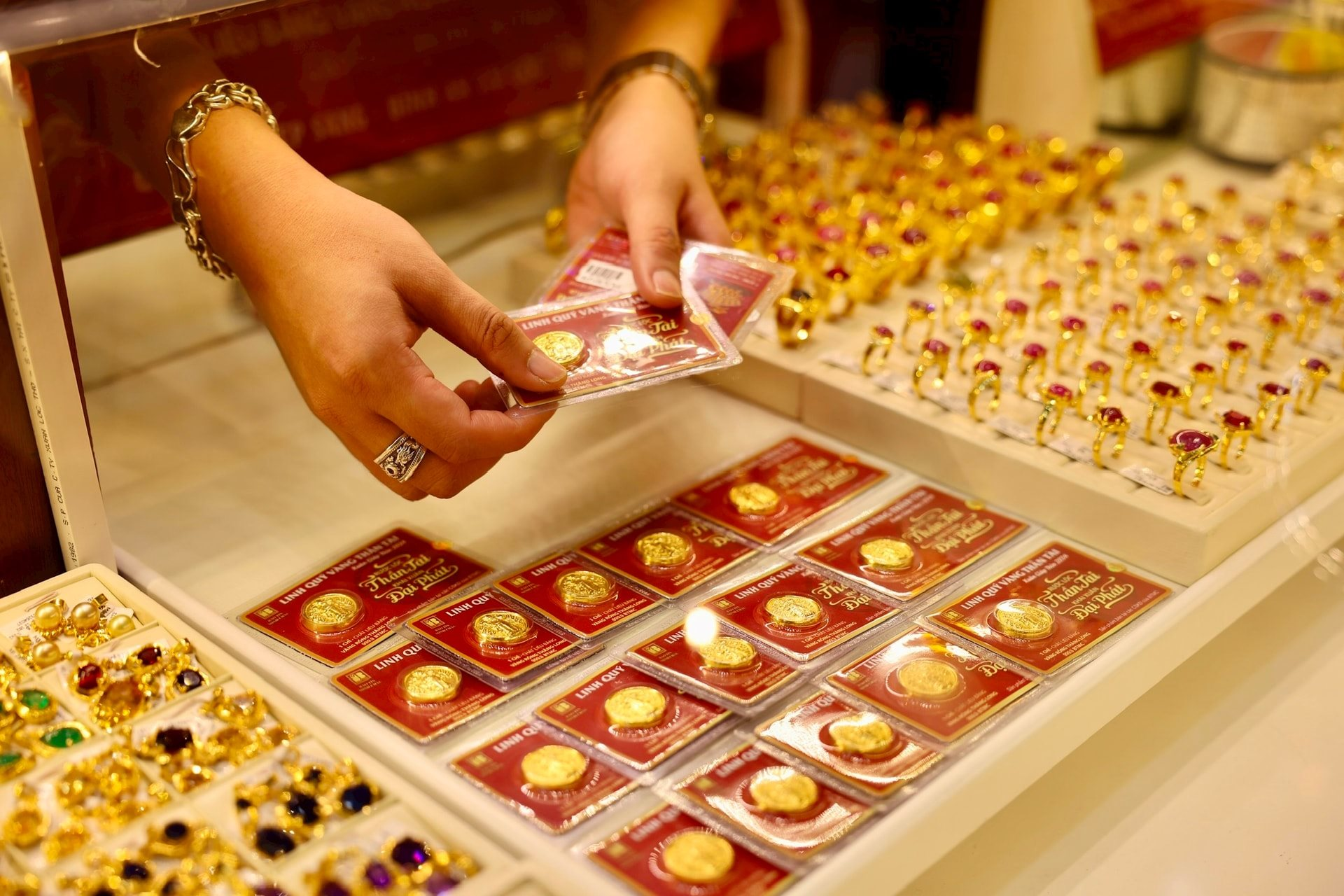 Tại Bảo Tín Mạnh Hải, nhẫn tròn ép vỉ tăng 1,2 triệu đồng/lượng lên 177,5 – 180,5 triệu đồng/lượng, tức 18,05 triệu đồng/chỉ. Vàng Tiểu Kim Cát 24k (9999) 0,1 chỉ cũng tăng lên 1,775 – 1,805 triệu đồng/sản phẩm.