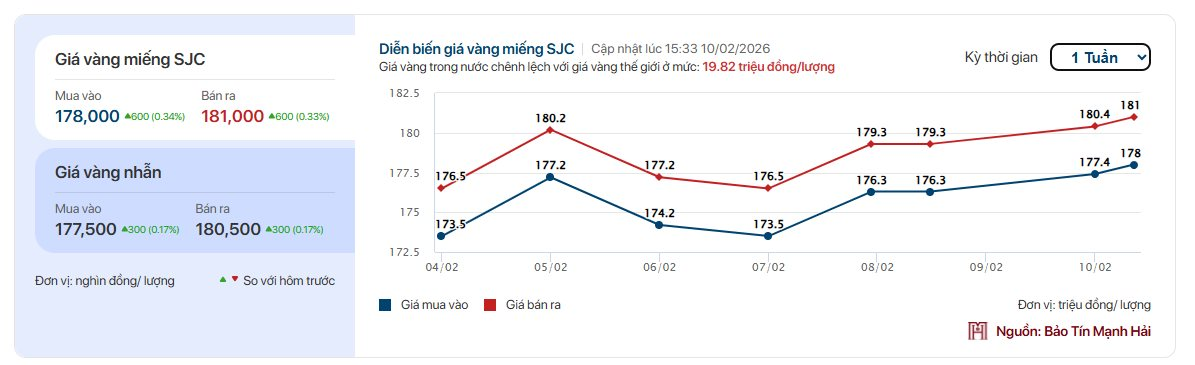 Mở cửa sáng 10/2, giá vàng SJC và giá vàng nhẫn trên thị trường đi ngang so với hôm qua. Hiện giá vàng miếng SJC phổ biến ở mức 177,4 – 180,4 triệu đồng/lượng.
