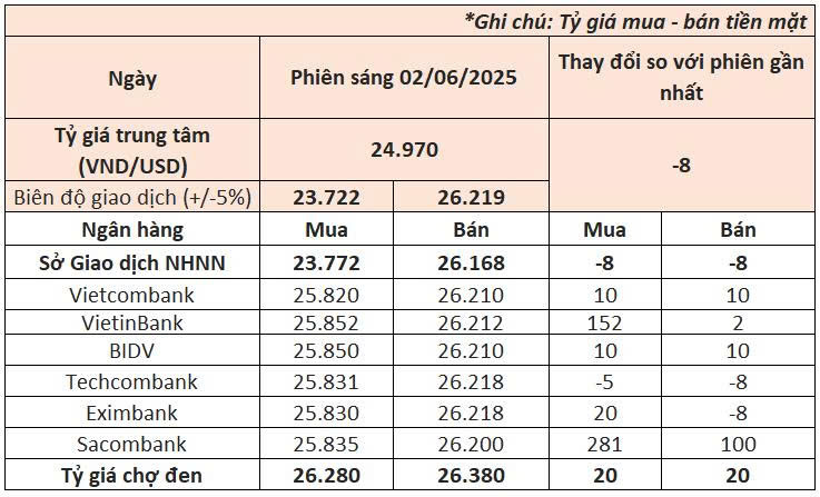Sáng nay (02/06), tỷ giá USD trung tâm được Ngân hàng Nhà nước công bố ở mức 24.970 VND/USD, giảm 8 đồng so với mức đóng cửa tuần trước. Trước đó, Ngân hàng Nhà nước đã liên tục tăng tỷ giá trung tâm trong 3 phiên cuối tuần trước với tổng mức tăng 31 đồng, đưa tỷ giá này lên cao kỷ lục 24.978 VND/USD.