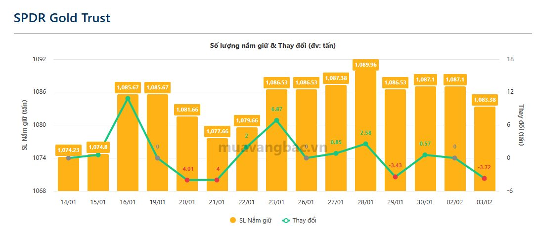 Theo cập nhật mới nhất từ muavangbac.vn, quỹ vàng lớn nhất thế giới SPDR Gold Shares sau 1 phiên “nằm im” đã trở lại bán ra hơn 3,7 tấn vàng trong ngày 3/2, tổng lượng nắm giữ ghi nhận hơn 1.083 tấn.