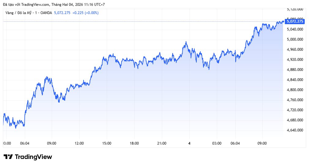 Sang tới đầu phiên 4/2, tính tới 10h, giá vàng thế giới tiếp tục hồi phục lên mức 5.054,4 USD/ounce và chỉ còn cách kỷ lục cũ 546 USD/ounce.