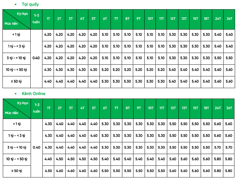 Kỳ hạn 24–36 tháng: 5,60% – 5,80%/năm, trong đó mức cao nhất 5,80%/năm áp dụng cho khách hàng gửi từ 50 tỷ đồng trở lên.