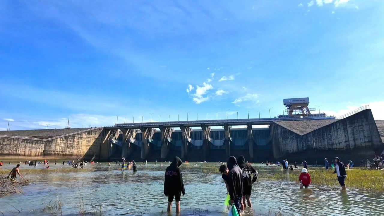 Cũng như thường lệ, biết tin nhà máy ngưng xả tràn, hàng trăm người dân đến từ nhiều địa phương lại tập trung về chân đập mang theo ngư cụ bắt cá.