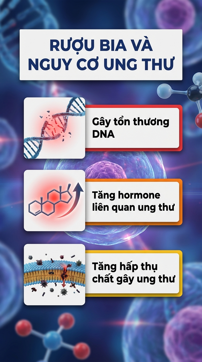 Trung tâm Kiểm soát và Phòng ngừa Dịch bệnh Hoa Kỳ (CDC) lý giải, lạm dụng rượu bia có thể làm tăng nguy cơ ung thư thông qua một số cơ chế sinh học khác nhau.