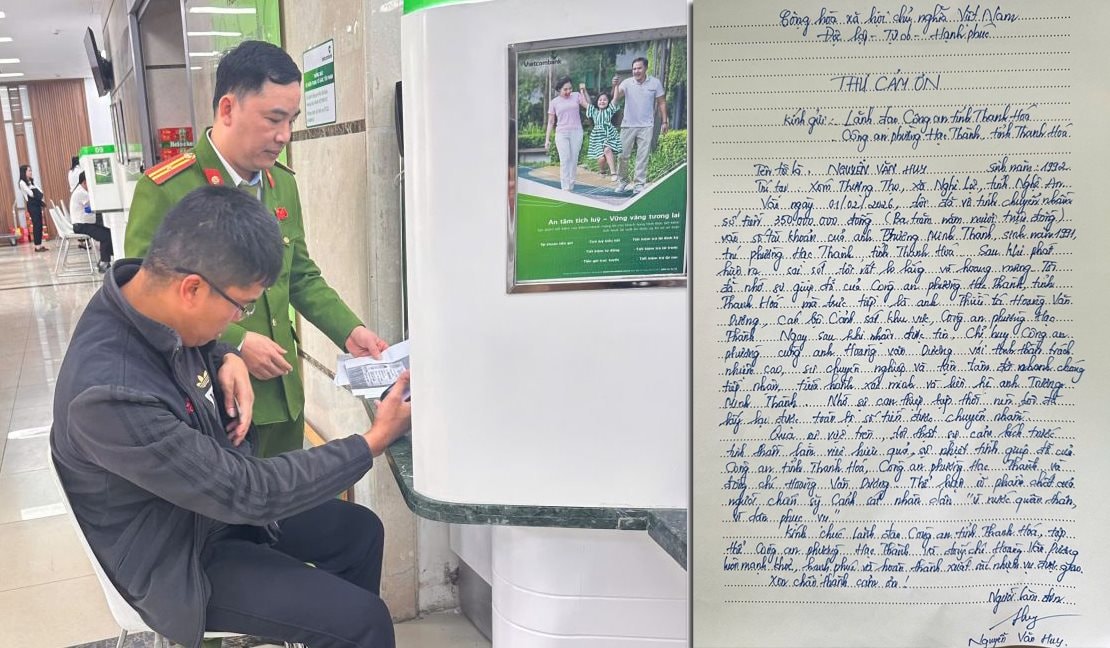 Sau khi nhận lại đủ số tiền chuyển khoản nhầm, anh Nguyễn Văn Huy đã cảm kích viết thư cảm ơn Công an phường. Ảnh: Công an tỉnh Thanh Hóa