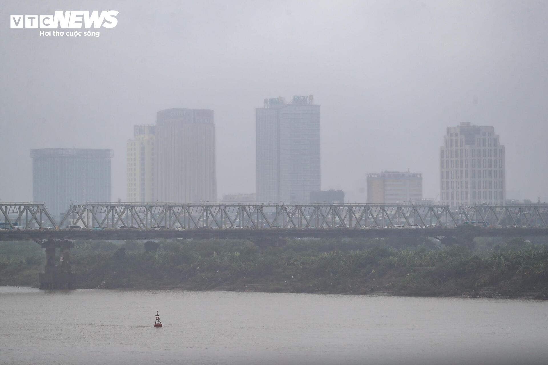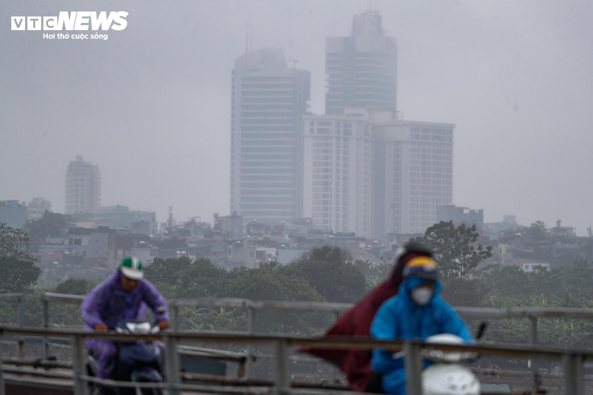 Hà Nội chìm trong làn sương dày và mưa phùn lất phất, những tòa nhà cao tầng ẩn hiện giữa không gian mờ ảo.