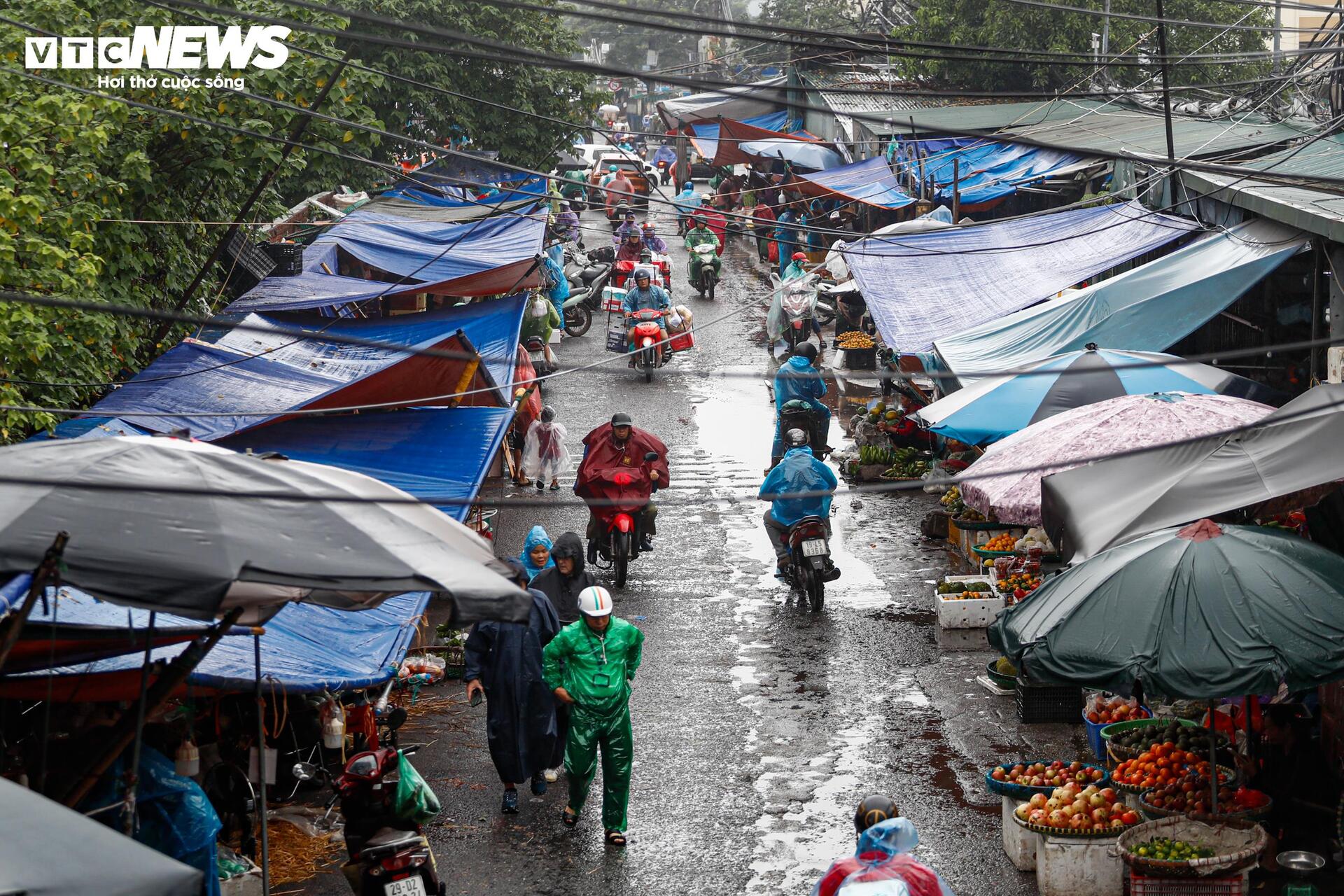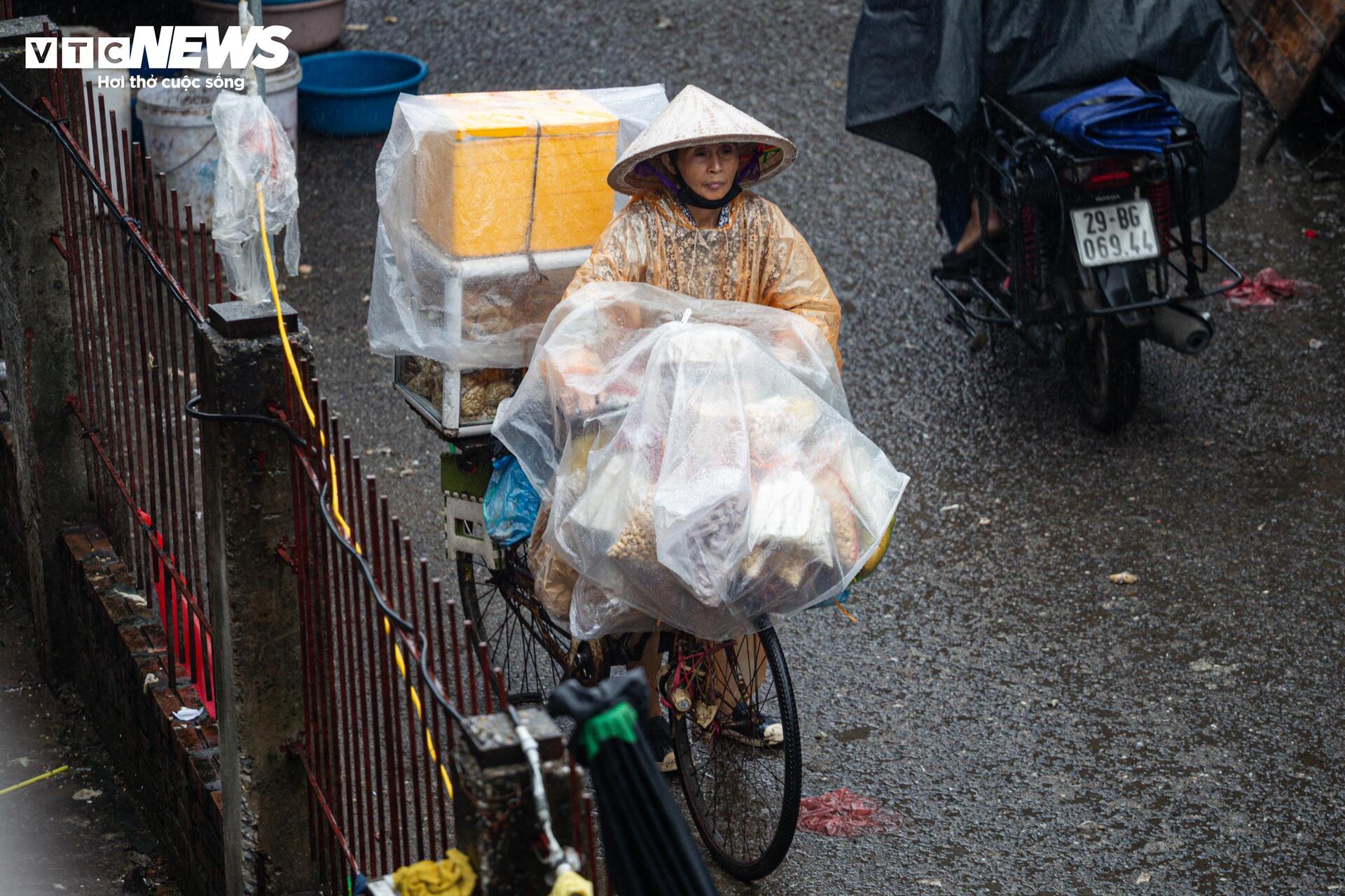 Tại khu vực chợ Long Biên, mưa phùn kéo dài khiến không khí buôn bán trầm lắng, nhiều tiểu thương than vắng khách, lượng người mua giảm rõ rệt.