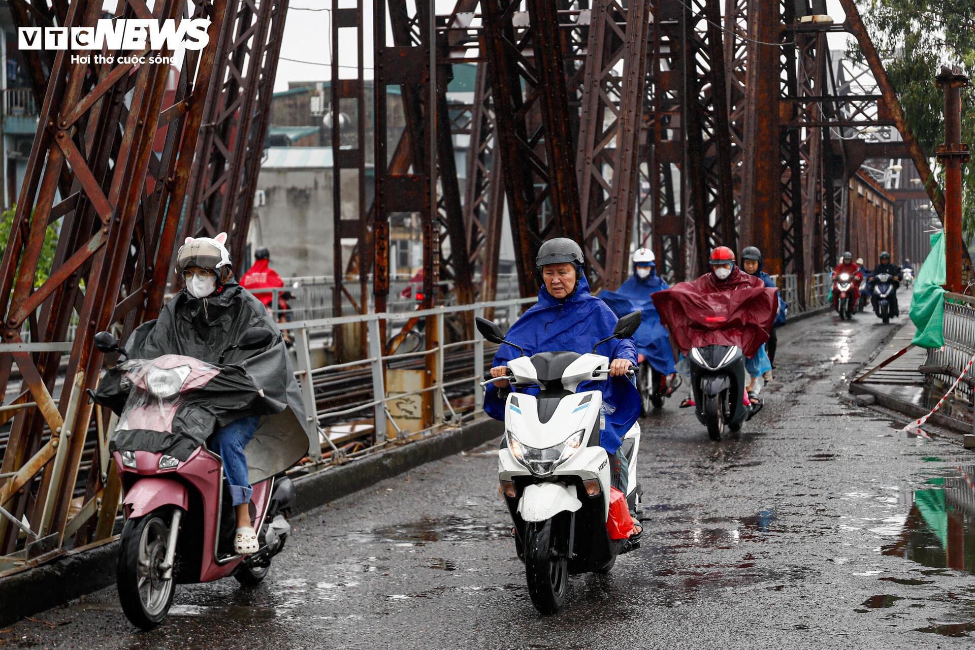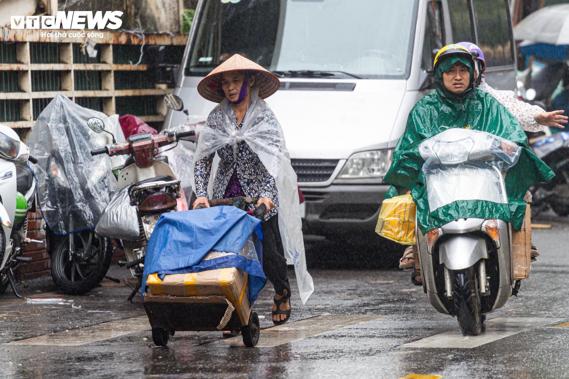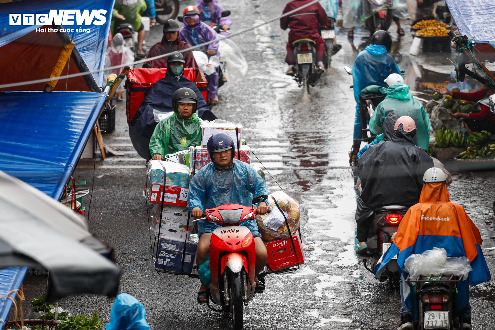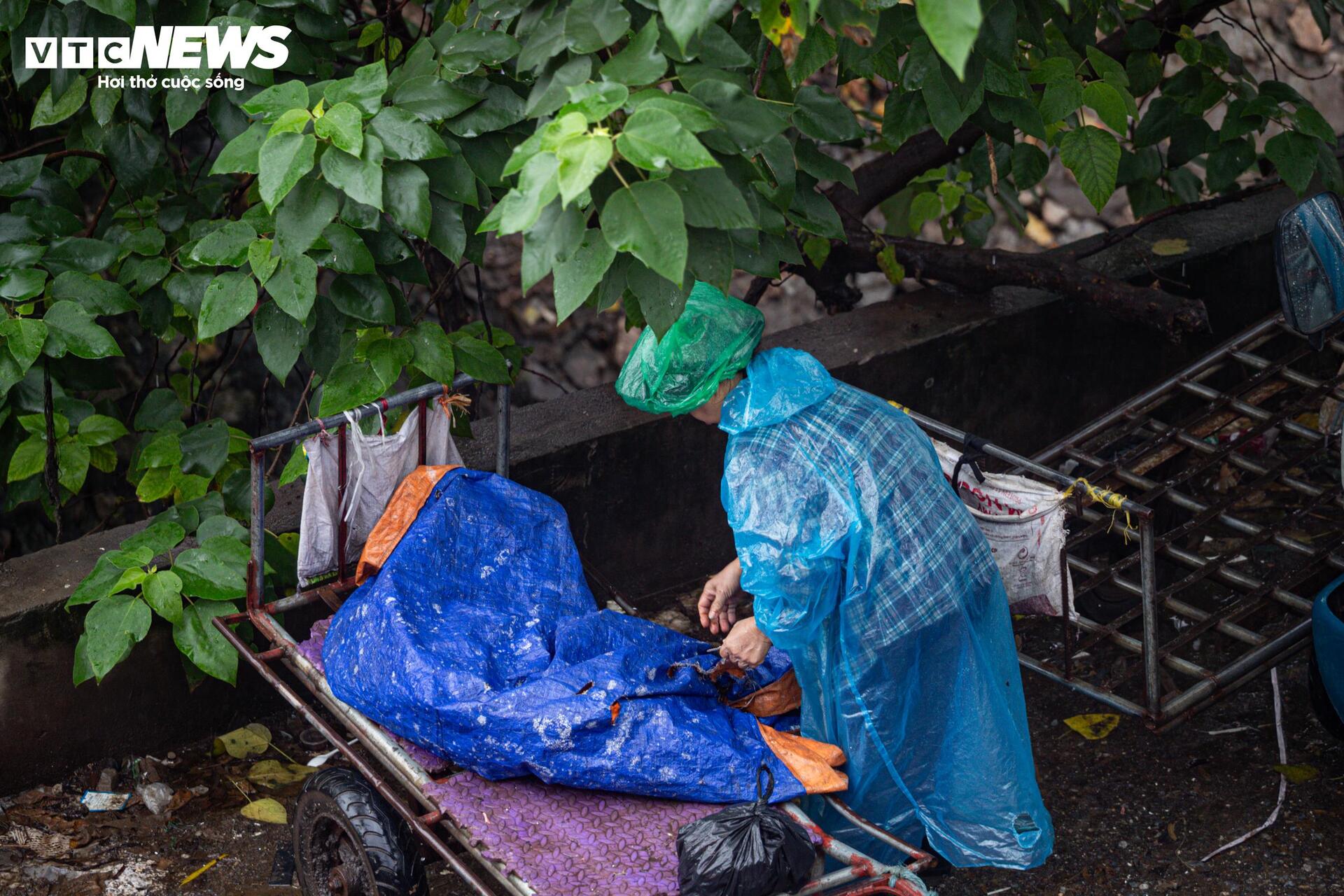 Chỉ với chiếc áo mưa mỏng và túi nilon đội đầu, nhiều người lao động vẫn cần mẫn mưu sinh, bám trụ với công việc thường ngày.