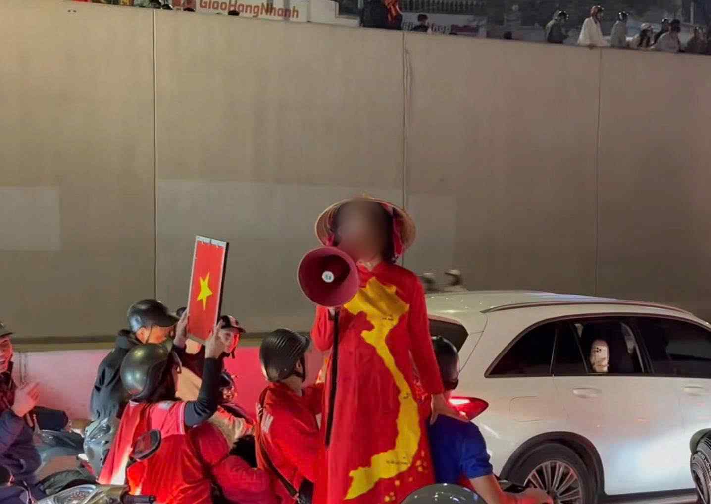 Trước đó, rạng sáng ngày 17/1, mạng xã hội xôn xao đoạn clip ghi lại cảnh người hâm mộ ở Hà Nội đổ ra đường "đi bão" ăn mừng chiến thắng của đội tuyển U23 Việt Nam ở vòng tứ kết giải U23 châu Á. Tuy nhiên, trong đám đông, một người phụ nữ mặc áo dài đỏ, đội nón lá, tay cầm loa, đứng trên yên xe máy rồi hô hào nhiều người tham gia giao thông phía sau cùng đua xe.