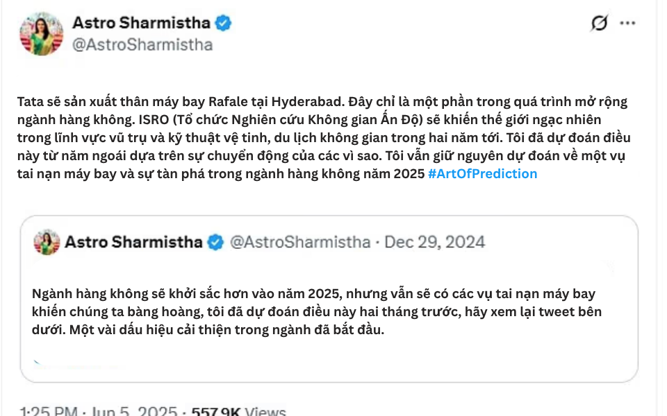 Chỉ một tuần trước khi chiếc Boeing 787 Dreamliner của Air India rơi và phát nổ tại Ahmedabad, Ấn Độ, nhà chiêm tinh có tên Astro Sharmistha đã đưa ra lời cảnh báo rợn người về một "vụ tai nạn hàng không gây sốc" trong năm 2025.