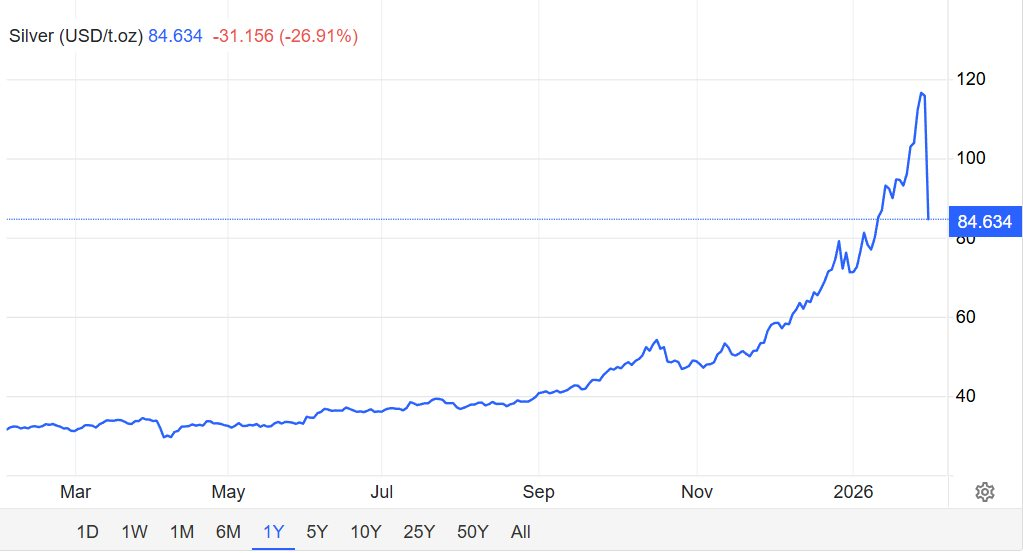 Trên thị trường quốc tế, giá bạc đã trượt mạnh từ vùng đỉnh tiệm cận 120 USD/ounce xuống quanh 84–85 USD/ounce. Diễn biến này diễn ra sau một giai đoạn tăng gần như dựng đứng trong vài tháng cuối năm 2025, khi bạc liên tục lập đỉnh mới và được ví như “vàng mới” trong làn sóng đầu tư kim loại quý.