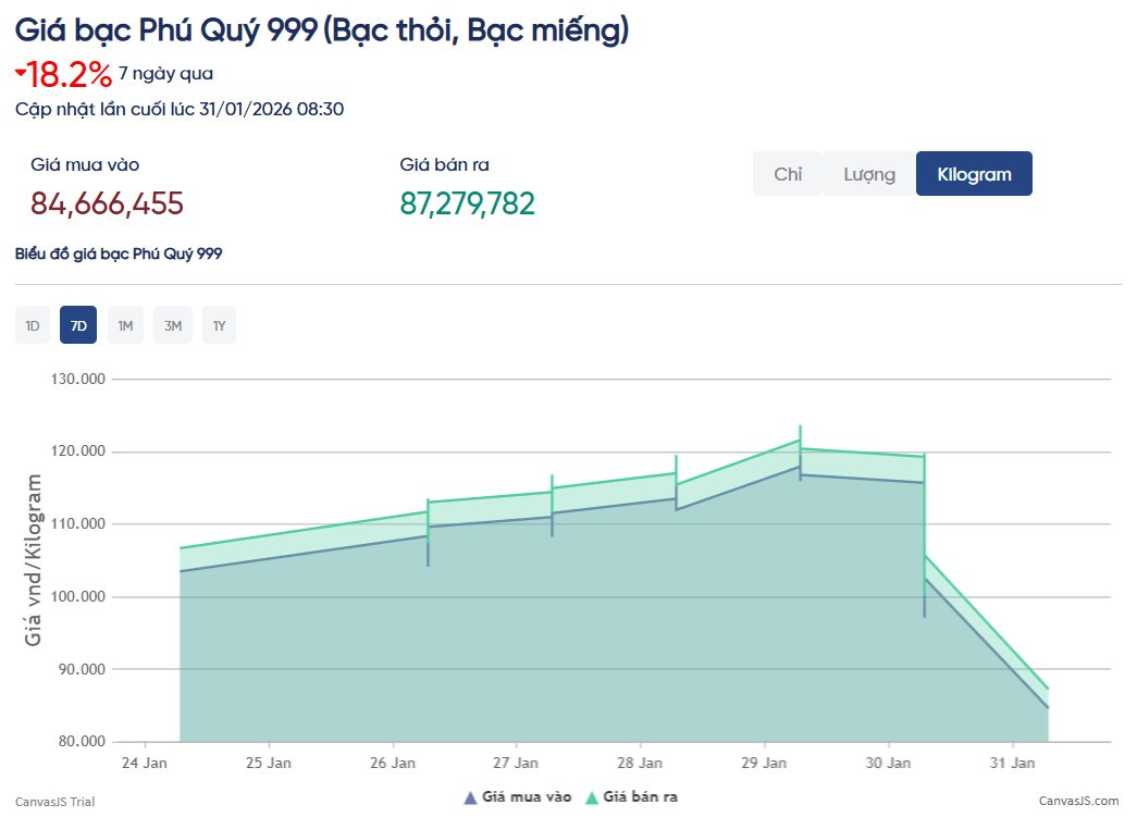 Tại Việt Nam, giá bạc Phú Quý 999 (bạc thỏi, bạc miếng) cũng phản ứng theo chiều hướng tương tự, dù có độ trễ nhất định. Từ vùng trên 120 triệu đồng/kg, giá đã nhanh chóng lùi về dưới 90 triệu đồng/kg chỉ trong vài phiên, cho thấy thị trường trong nước đang bám sát biến động quốc tế hơn so với trước đây.