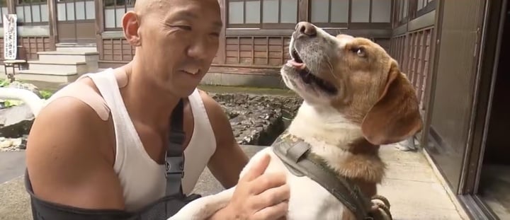 Nhà sư nhận nuôi chú chó bị bỏ rơi, sau đó được chó cứu khỏi con gấu hung dữ. (Ảnh: Nippon Television)