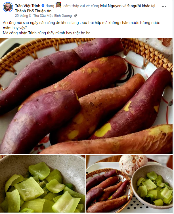 Những bữa ăn của Việt Trinh thường chủ yêu là rau, củ, quả cô tự trồng trong vườn. Món ăn nào cũng mộc mạc, dân dã, được nấu bằng phương pháp hấp hoặc luộc. Nếu theo dõi trang cá nhân của "nữ hoàng ảnh lịch" thập niên 90, khán giả sẽ thấy 1 món ăn xuất hiện rất nhiều lần trong bữa cơm của cô đó là khoai lang.